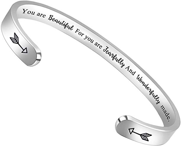 Motivational Jewelry has become a very relevant option for those on the path of personal growth. If you are going to go this route, this silver inspirational bracelet is a wonderful choice as it serves up a daily dose of empowerment with a personal mantra or specialized inscription hidden on the inside of the cuff. Made from stainless steel, there are quite a few inscriptions to choose from to customize it for you very special girl boss.